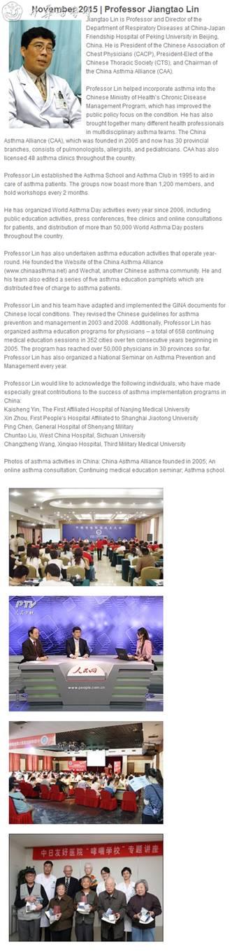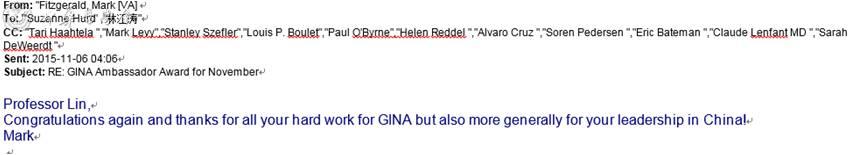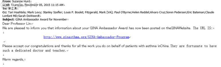 林江涛教授荣膺GINA大使奖,GINA总监SuzanneHurd博士和执委会主席、董事会主席J Mark Fitzgerald 教授写信向林教授祝贺,该殊荣在GINA官网(http://www.ginasthma.org/GINA-Ambassador-Program)公示,以表彰林江涛教授及中国团队在哮喘防治管理中所做的贡献。